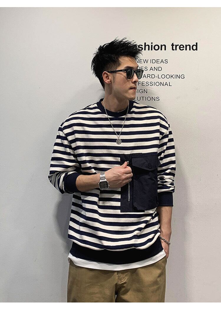 ストライプセーター ポケットジャケット ラウンドネックトップス Oネック ステッチ Xu_Tailang10446386601