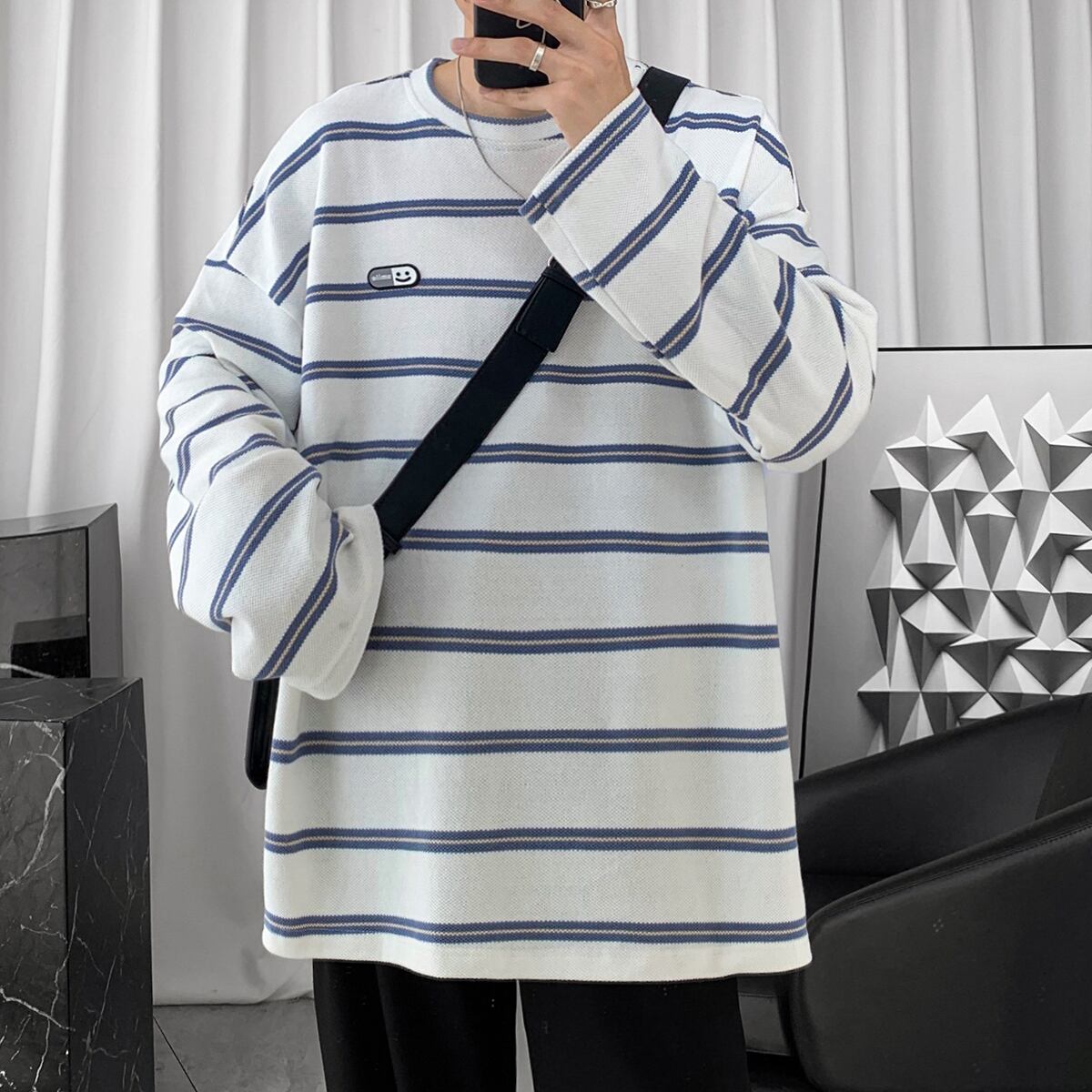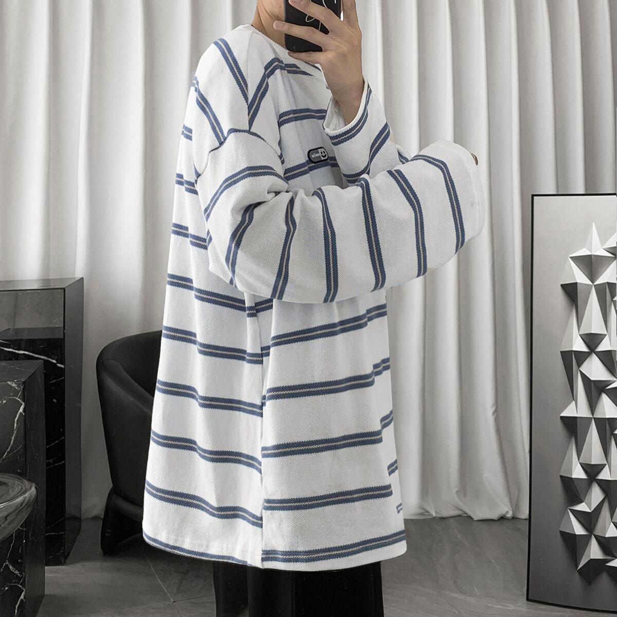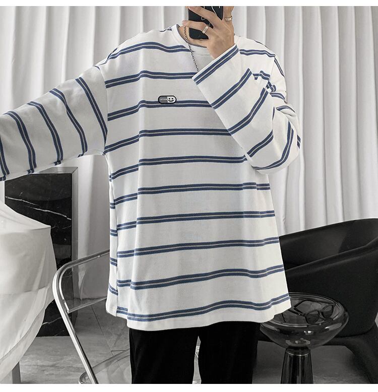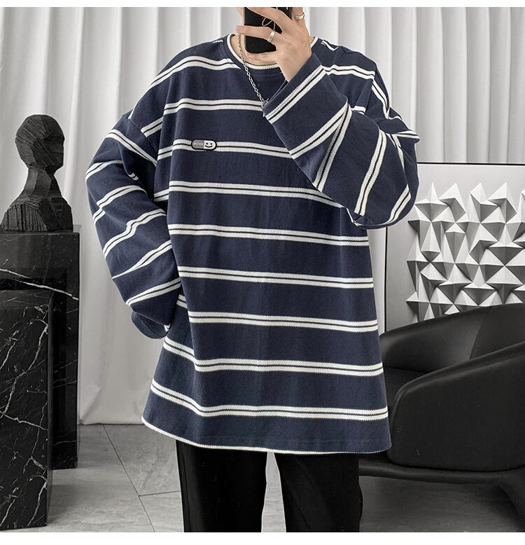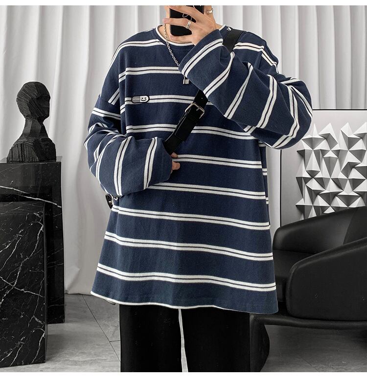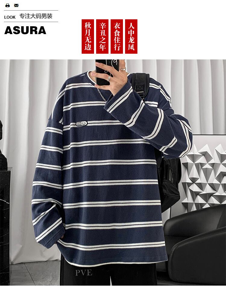 ニットストライプTシャツ シャツ ルーズオータムカジュアルスタンダード ロング レトロ 大きめサイズ 秋物 ASURAプラスサイズメンズ70886608275