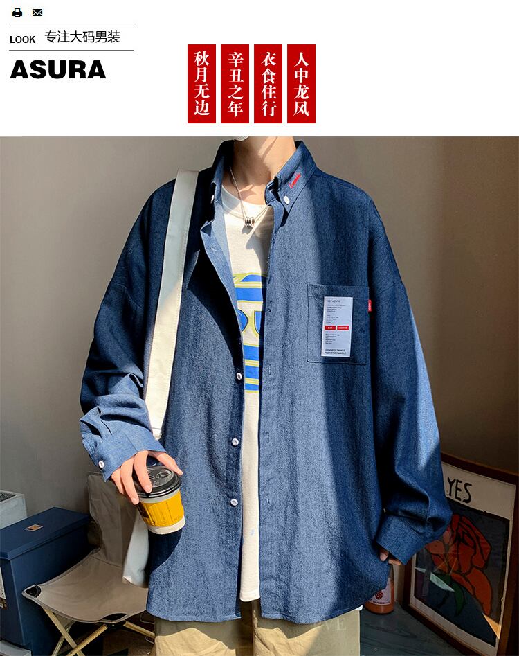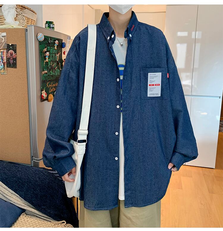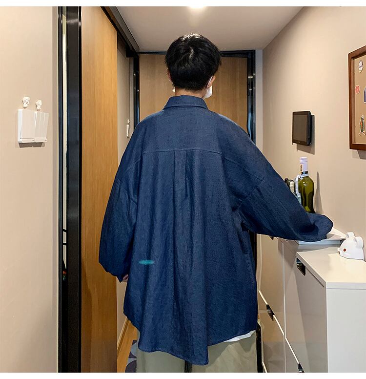 シャツ ルーズジャケット スプリングオータムスタンダードブルー ロング レトロ 大きめサイズ 春物 秋物 ASURAプラスサイズメンズ93472027577